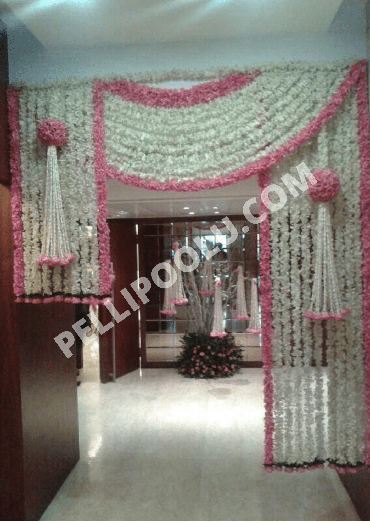 MATERIAL USED: Fresh Roses (Different Types), Banthi Flowers, Chamanthi Flowers, White Lily Flowers, Green Grass, Standard Threads, Cloth Ribbons…Etc