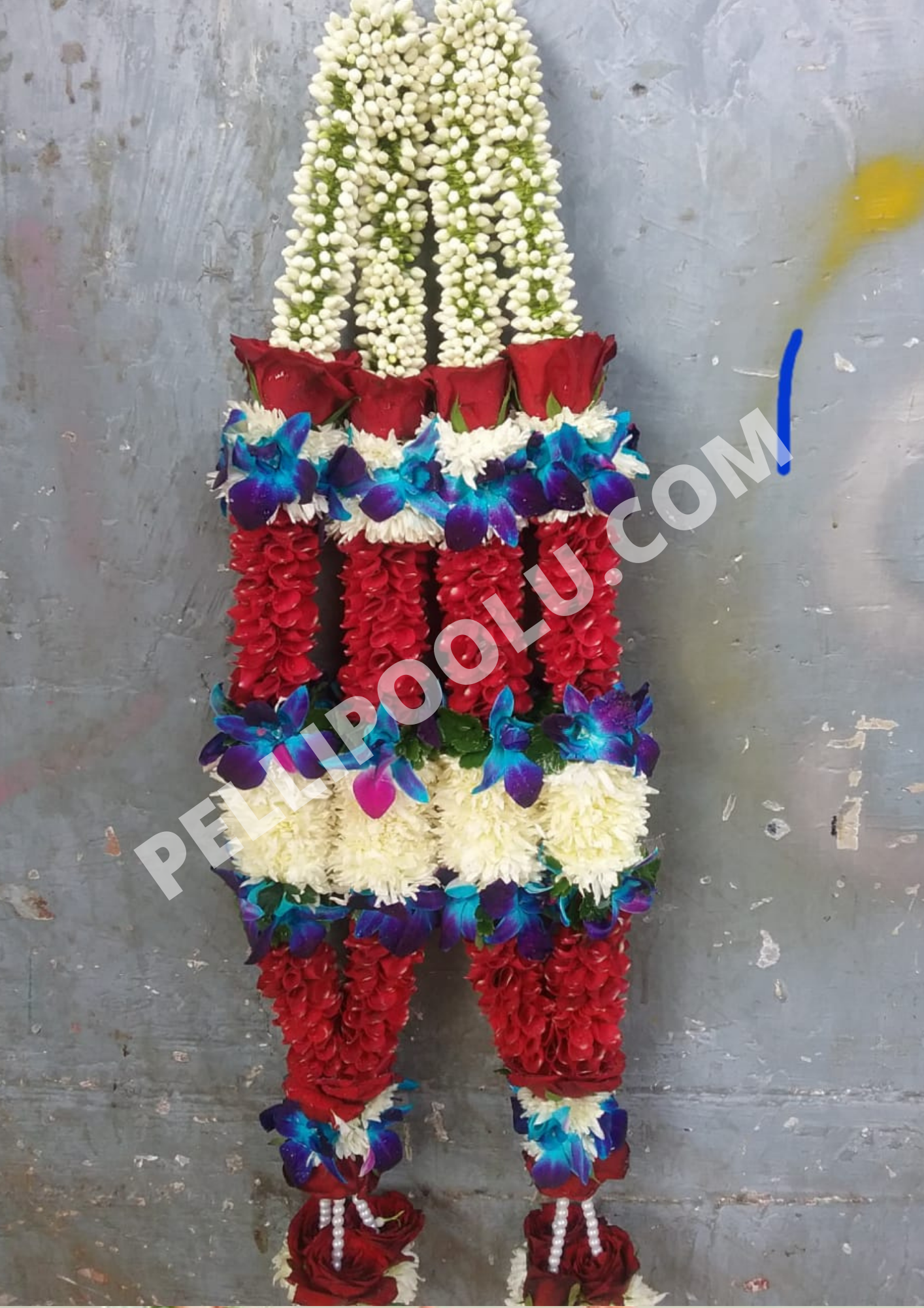 MATERIAL USED: Fresh Rose Petals (Dutch Flower), Special Green Grass, Tagar Flower (A type of Jasmine Flowers), Gold/Silver Cloth Tissues & Ribbons, Standard Threads, White Lilly Flowers, Roses hanging.