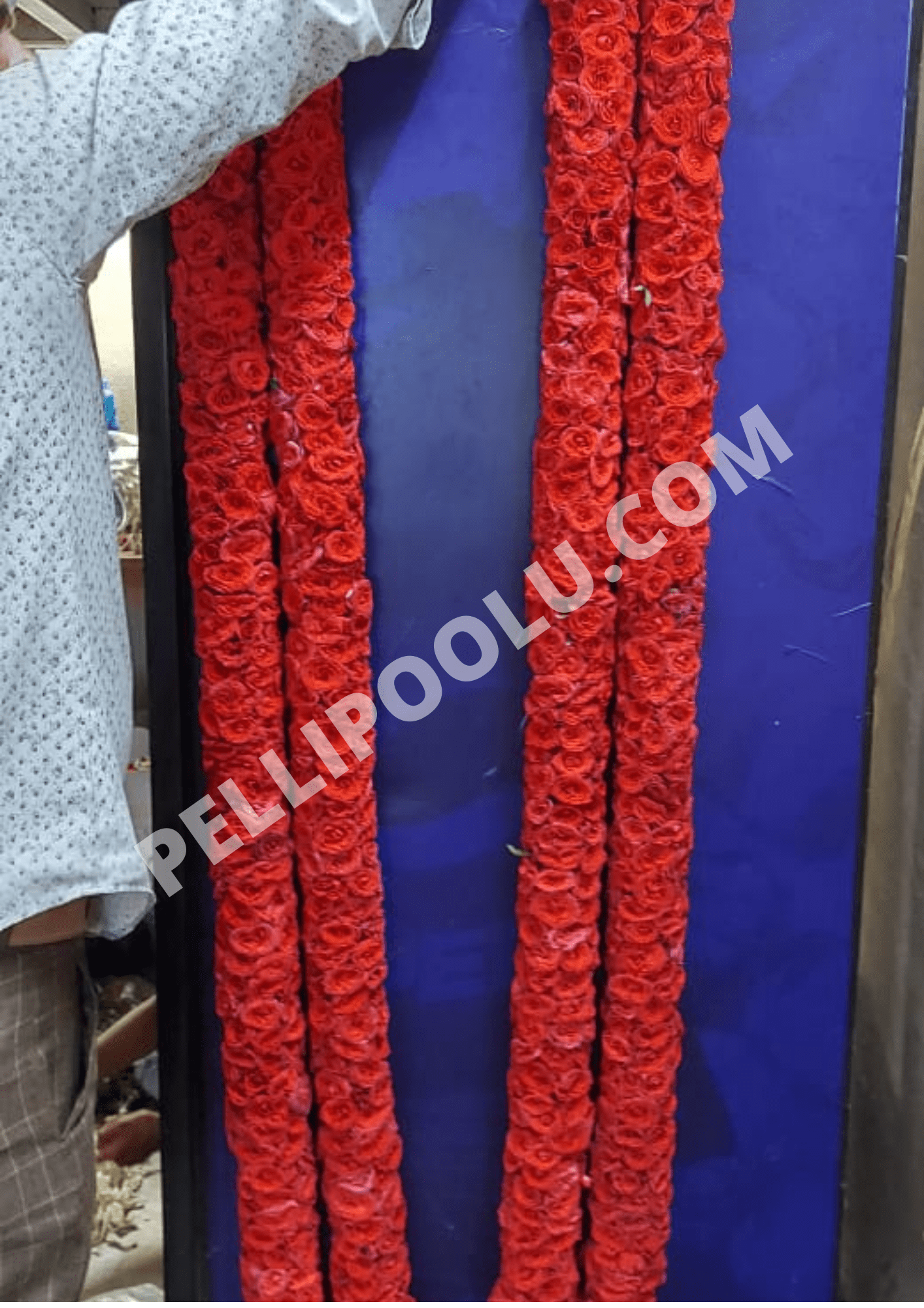 MATERIAL USED: Fresh Roses (Different Types), Banthi Flowers, Chamanthi Flowers, White Lily Flowers, Green Grass, Standard Threads, Cloth Ribbons…ETC